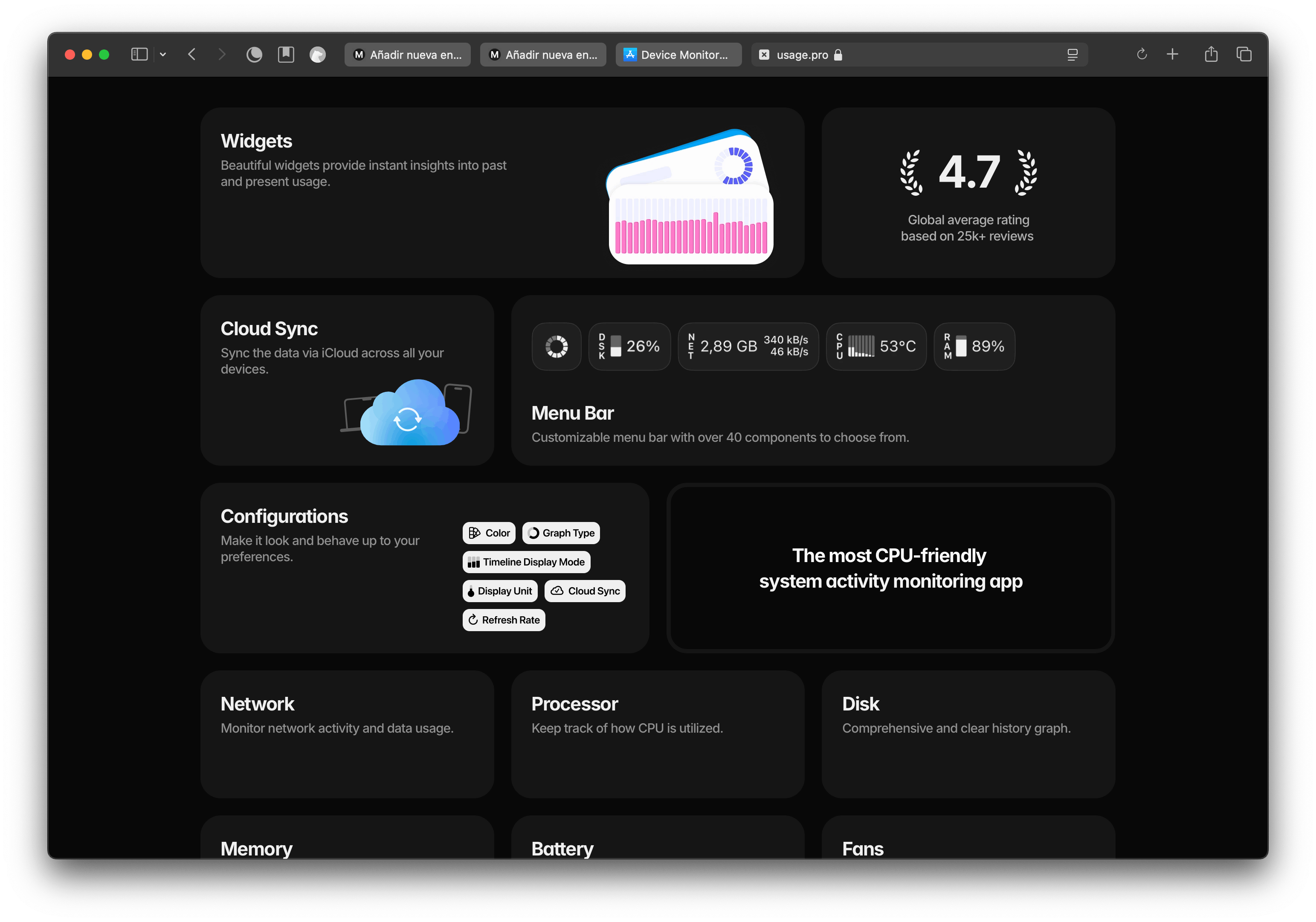 • Interfaz más limpia y moderna: Usage ofrece una experiencia visual más agradable y menos recargada que iStat Pro y CleanMyMac.