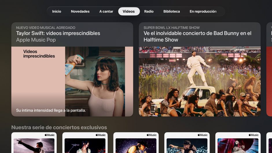 - Contenido Destacado: Se muestran producciones visuales de alto perfil, como una colección de “vídeos imprescindibles” de Taylor Swift y el concierto de Bad Bunny en el Halftime Show del Super Bowl LX.