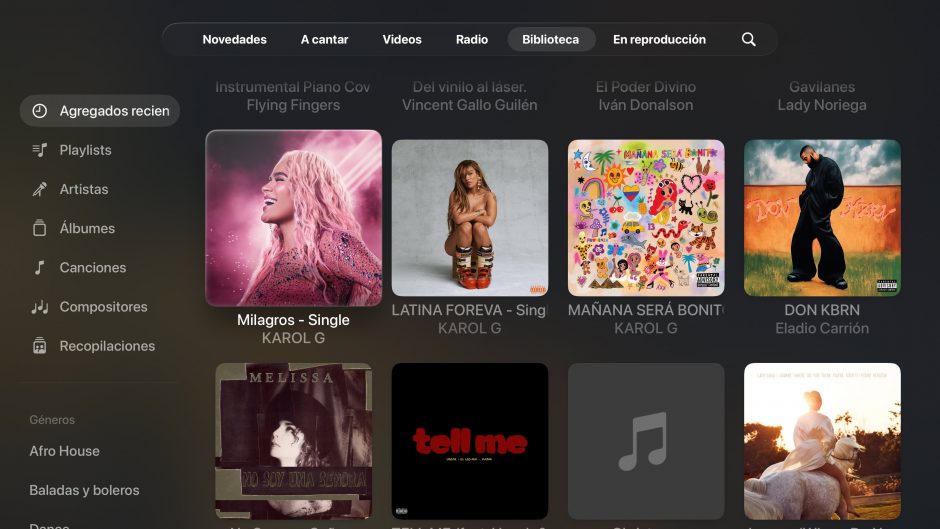 - Navegación por Géneros: En la parte inferior izquierda se observa un filtro por géneros musicales como Afro House y Baladas y boleros, facilitando la búsqueda dentro de la colección personal.