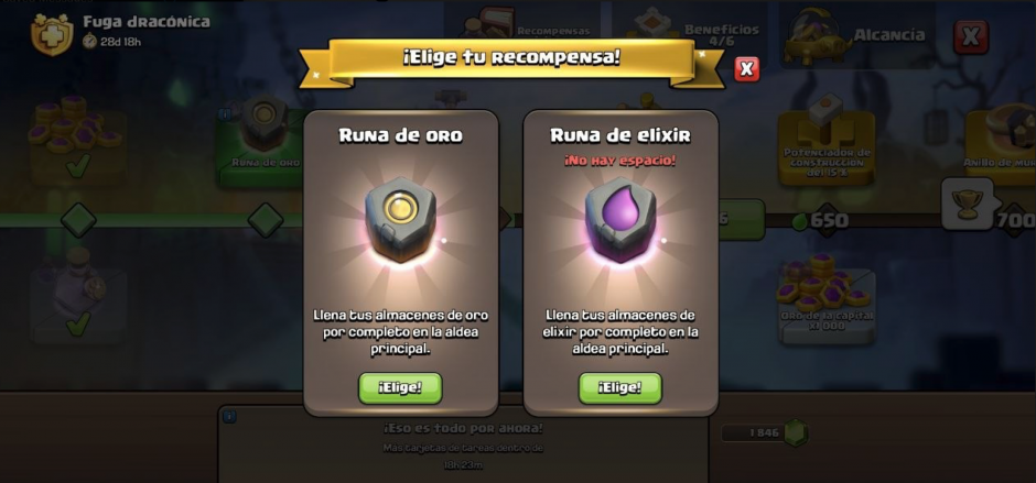 Antes, recibir una runa de un recurso que ya tenías al máximo generaba una sensación de desperdicio. Ahora, el sistema permite elegir, por ejemplo, entre una Runa de Oro o una Runa de Elixir, permitiendo que el jugador optimice su progreso de forma personalizada.